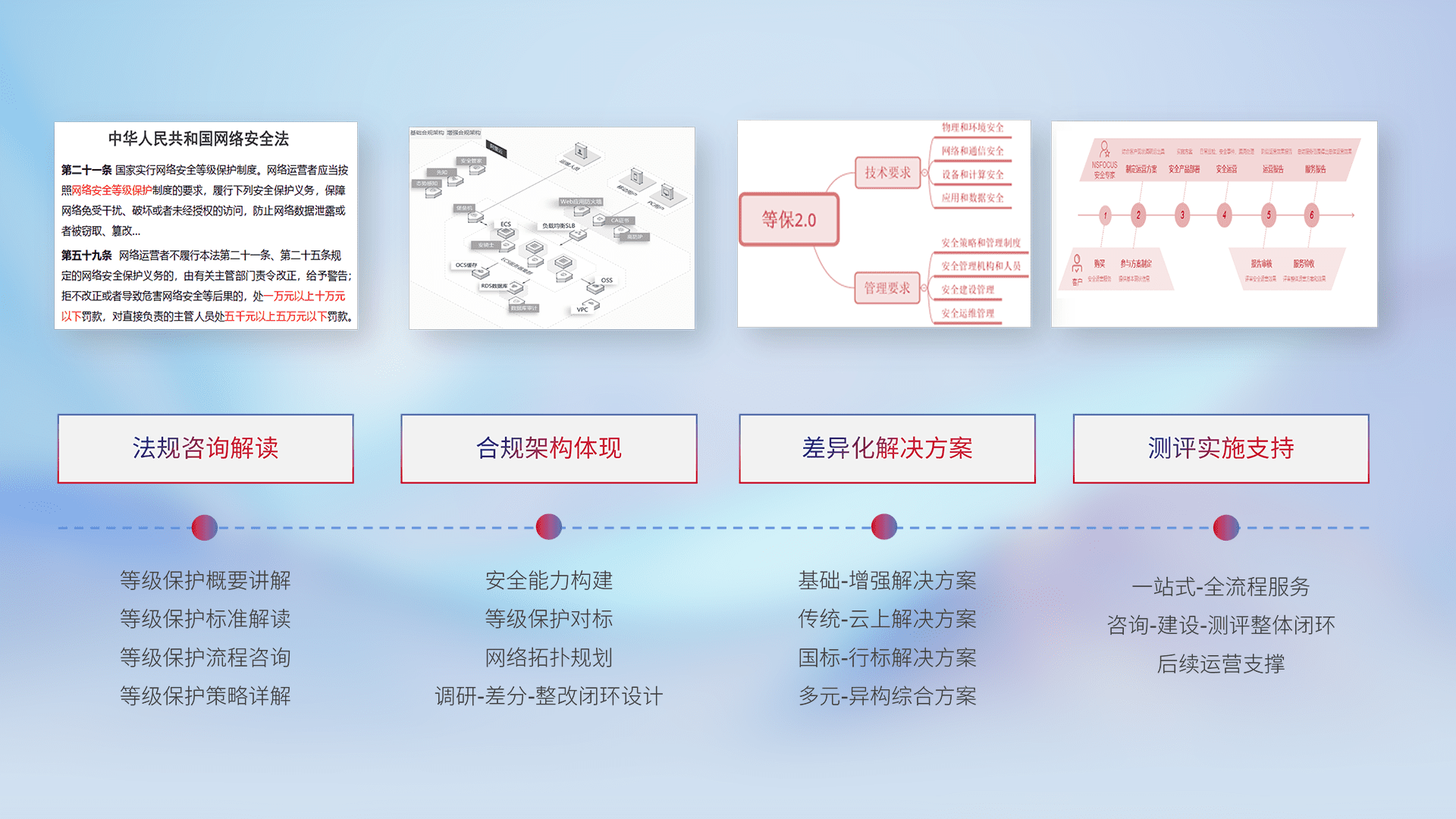 通过专业的法律咨询解读、、、合规架构体现、、、、差异化解决方案、、、、测试实施支持等服务,,,,为客户量身打造等保合规体系。。